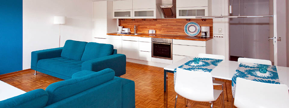 große Wohnküche mit Backofen, Ceranfeld, Kühlschrank, Gefrierfach, Geschirrspüler, Kinderhochstuhl,